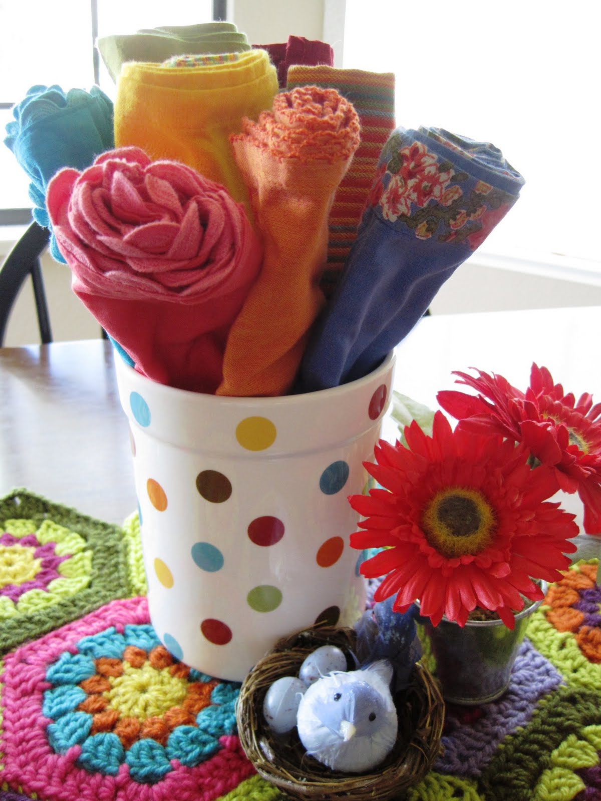 One day not long ago, my daughter and I were looking for crochet patterns and happened upon some incredible blogs, some of which I intend to share once I figure out how to do this blog thing. I'm hooked! I saw beautiful creations and photography and have been anxious to set up my own blog ever since.....so here goes! My first picture is a result of a blog by Attic 24 (I will link to it when I figure out how). She has amazing projects, most of which include instructions......yesssssss! And she even includes pictures with her directions.....happy dance! I went out right away and bought a bunch of bright colored yarn and started making hexagons. Unsure of what to actually do with them once completed, I just kept making them until the idea of a table runner popped into my head. Then I had to find colorful goodies to go with it, and the rest is history!